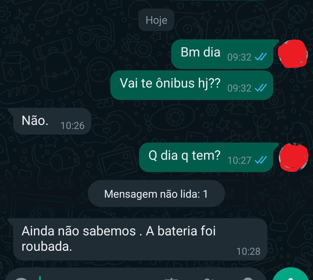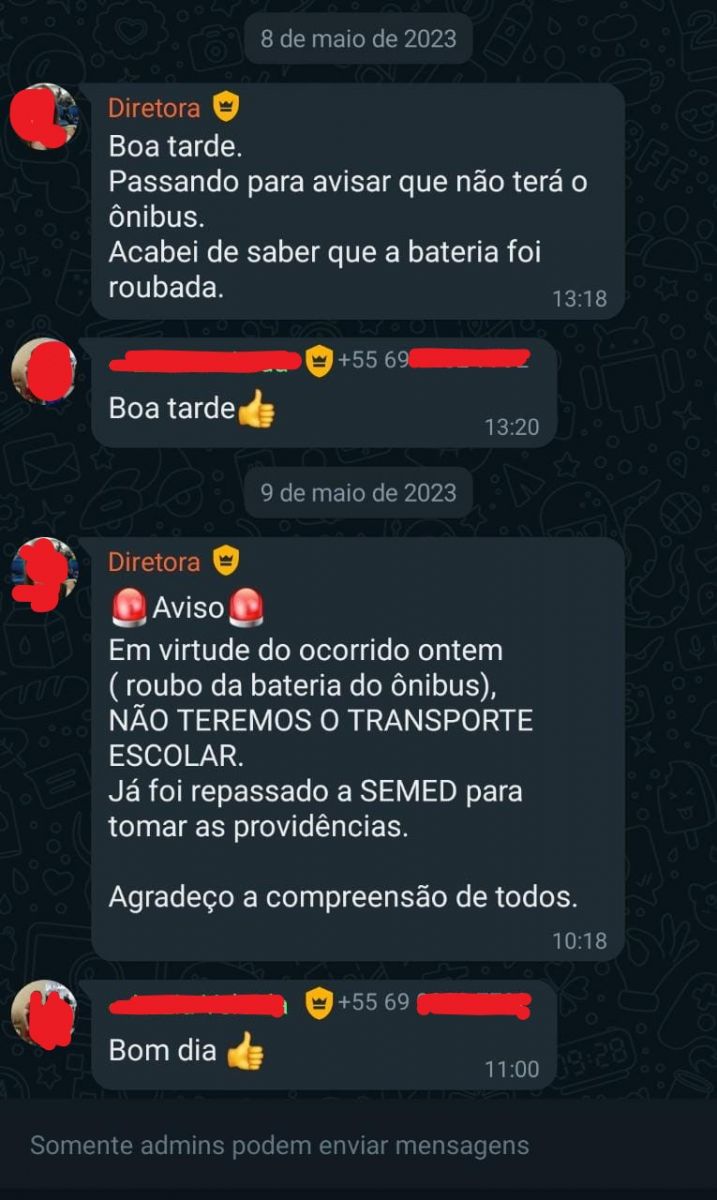Os denunciantes enviaram vários prints de tela, onde a diretora do colégio público limita-se apenas a dizer que não haverá transporte escolar, porém não dá nenhum prazo de solução do problema.