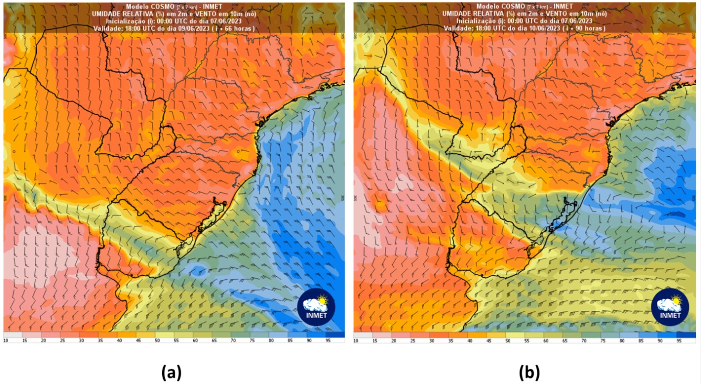 Figura 1: Previsão do modelo Cosmo para umidade relativa do ar na tarde de (a) sexta-feira (9) e (b) no sábado (10).