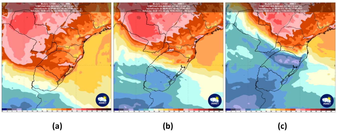 Figura 2: Previsão do modelo Cosmo para temperaturas máximas na (a) sexta-feira (9), (b) sábado (10) e (c) domingo (11), todas às 15h (horário de Brasília).