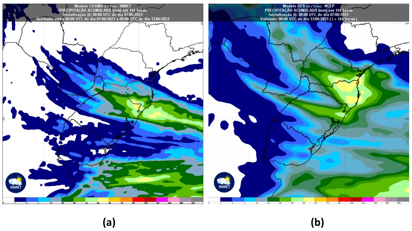 Figura 3: Precipitação (chuva) acumulada em 144 horas prevista pelos modelos (a) Cosmo e (b) GFS.