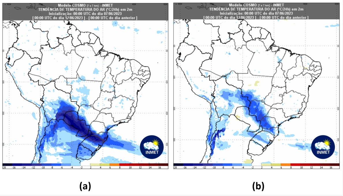 A figura 4 mostra a tendência de queda da temperatura do ar entre o fim do domingo e a segunda-feira, indicando declínio de mais de 10°C em 24h entre o Rio Grande do Sul e Santa Catarina e em áreas mais ao sul de Mato Grosso do Sul ao Paraná, além do litoral sul de São Paulo.