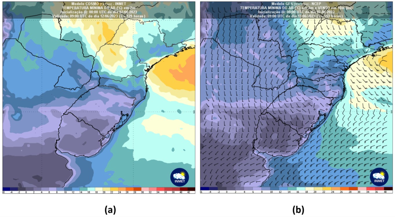 Figura 5: Temperatura mínima prevista para esta (a) segunda (12), de acordo com o modelo Cosmo, e (b) terça-feira (13), conforme modelo GFS.