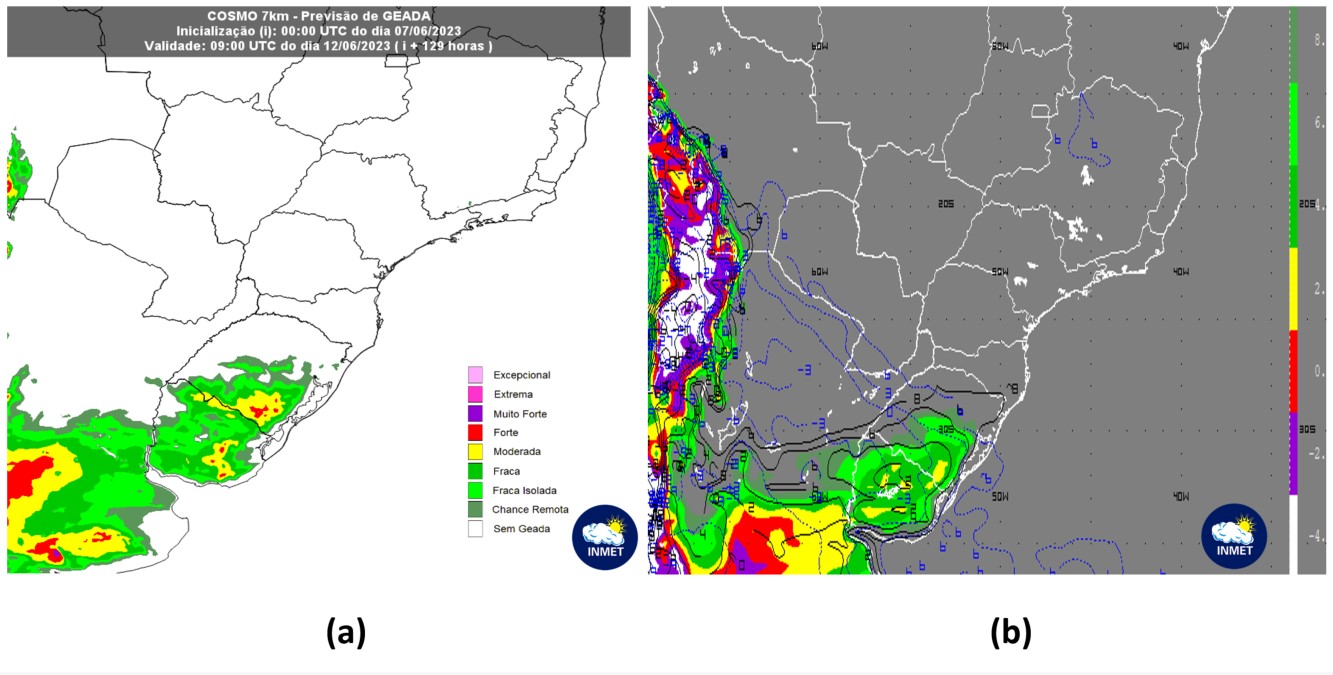 Figura 6: Mapa indicativo de geada para (a) segunda-feira (12), de acordo com o modelo Cosmo, e (b) terça-feira (13), conforme modelo GFS.