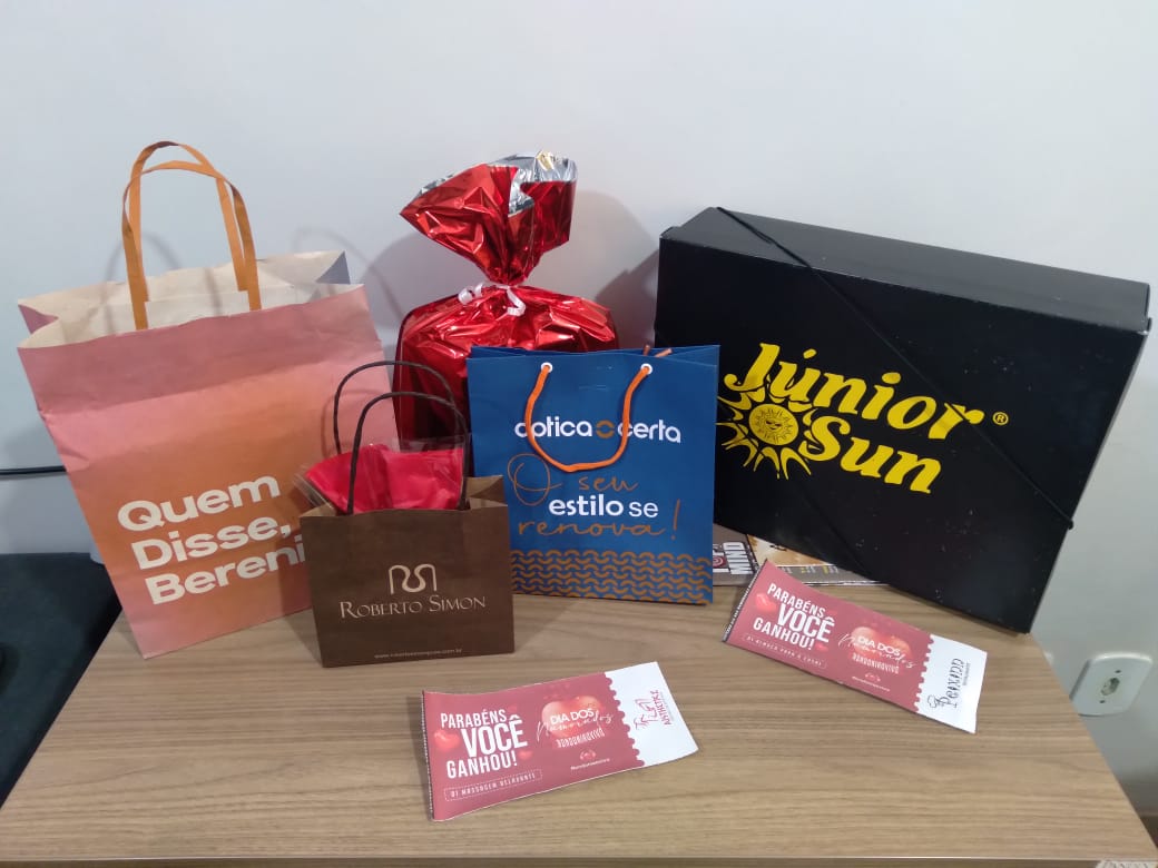 Os prêmios são produtos e serviços da Aisthetiké Centro de Estética, Óptica Certa, Roberto Simon Jóias, Junior Sun, Quem Disse, Berenice?, Stock Musical e Peixinn Restaurante.