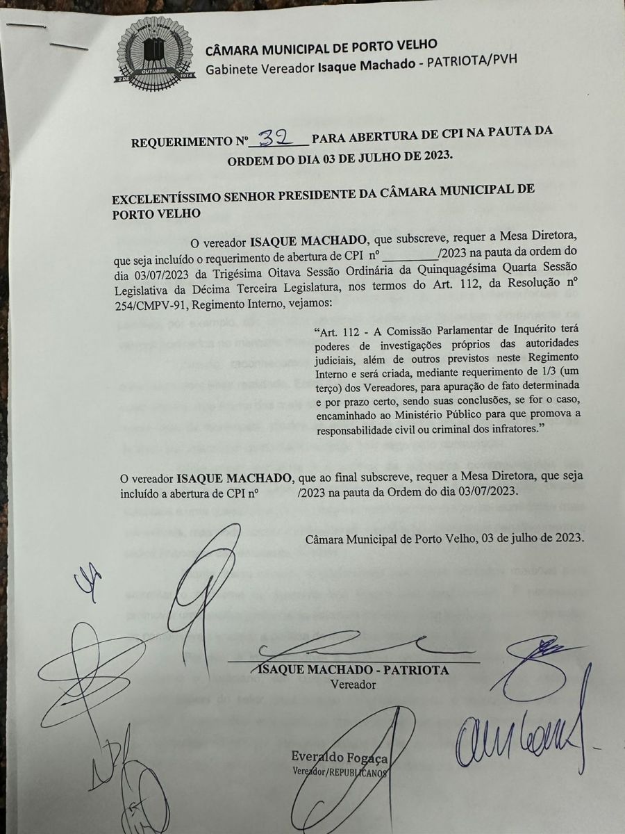 Os vereadores Isaque Machado, Everaldo Fogaça, Rai Ferreira, Júnior Queiroz, Jurandir Bengala, Márcia Socorrista e Gilber Mercês apresentaram um requerimento para a abertura de uma Comissão Parlamentar de Inquérito (CPI) para investigar o aumento dos preços dos combustíveis em Porto Velho e distritos. O pedido foi feito na sessão da última segunda-feira (03).