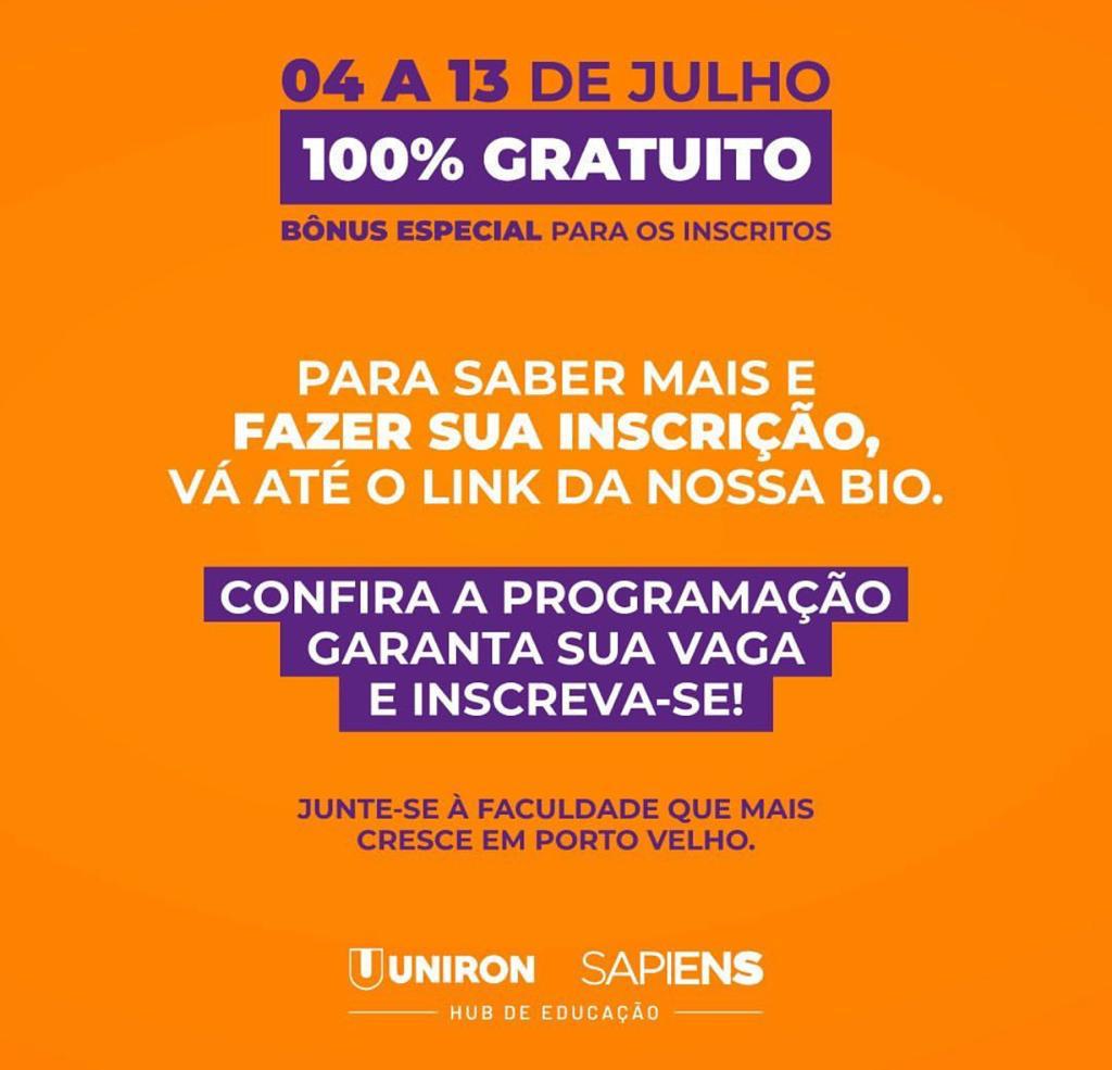 Entre os dias 04 e 13 de junho, de forma totalmente gratuita, a Uniron Sapiens vai promover a Campus Tour Experience, onde os futuros alunos da faculdade que mais cresce em Porto Velho vão descobrir seus potenciais máximos participando de aulas experimentais nas mais diversas áreas do conhecimento.