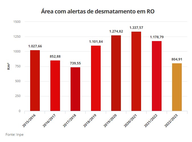 Rondônia registrou entre os meses de agosto de 2022 e julho de 2023 uma diminuição de 28% nos alertas de desmatamento, em comparação com o mesmo período do ano anterior. A redução foi de aproximadamente 517 km², segundo dados do Terra Brasilis, plataforma desenvolvida pelo Instituto Nacional de Pesquisas Espaciais (INPE).