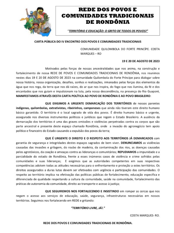 Em carta pública denunciaram que “a ausência da demarcação dos territórios é uma das graves omissões e violências perpetradas contra os corpos que são parte ancestral e presente deste espaço chamado Rondônia, onde a invasão do agronegócio tem apoio político e financeiro do Estado causando a expulsão dos povos da terra”.