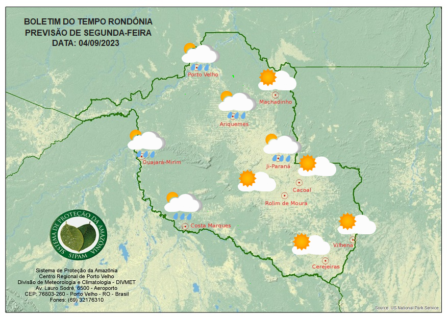 A previsão ainda será de um dia ensolarado e de muito calor em todas as áreas, com nebulosidade variando de poucas nuvens a parcialmente nublado, mas sujeito a pancadas rápidas em pontos próximos a Porto Velho, Ariquemes, Guajará-Mirim, Ji-Paraná e Costa Marques.