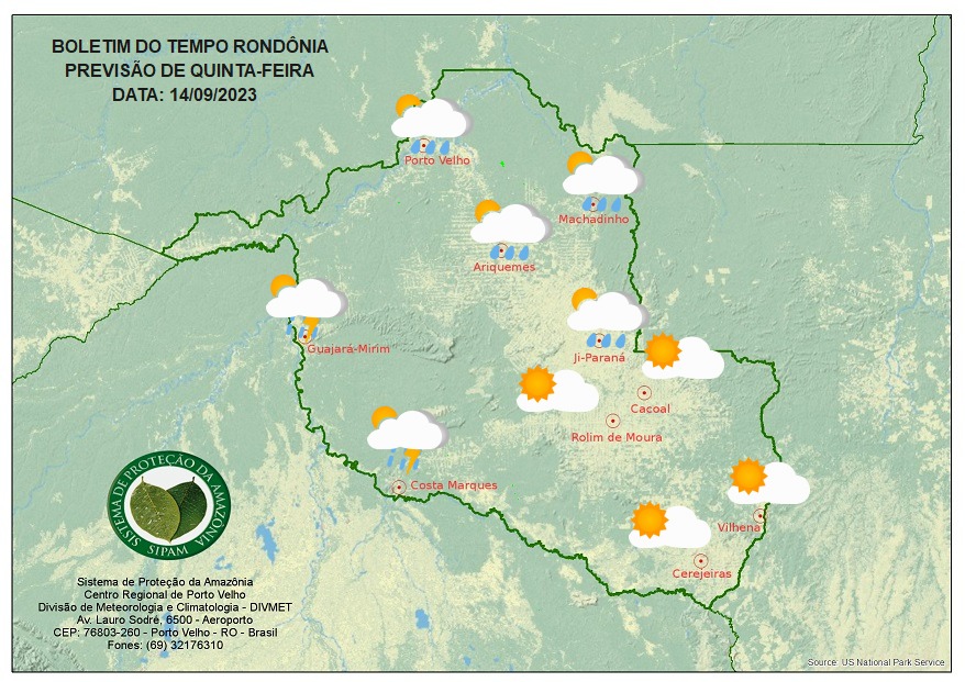 A previsão para esta quinta-feira (14), é de sol entre nuvens e tempo abafado em todo o estado. O tempo varia de parcialmente nublado a nublado e à tarde e no início da noite ocorrem pancadas de chuva com trovoadas isoladas nas cidades do Vale do Guaporé e do Mamoré e Porto Velho.