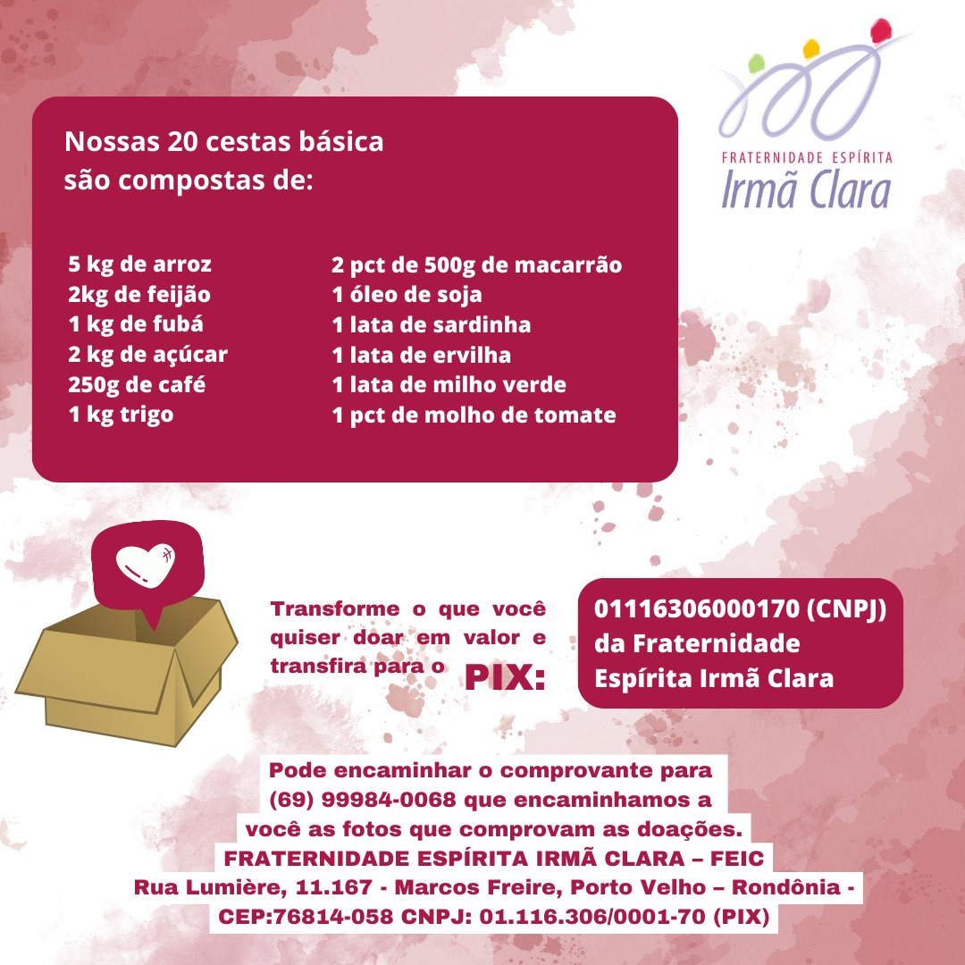 A Fraternidade Espírita Irmã Clara, que atua há mais de 30 anos no Bairro Marcos Freire, na zona Leste de Porto Velho, precisa de doações para montar 20 cestas básicas e distribuir para famílias pré-cadastradas na região.