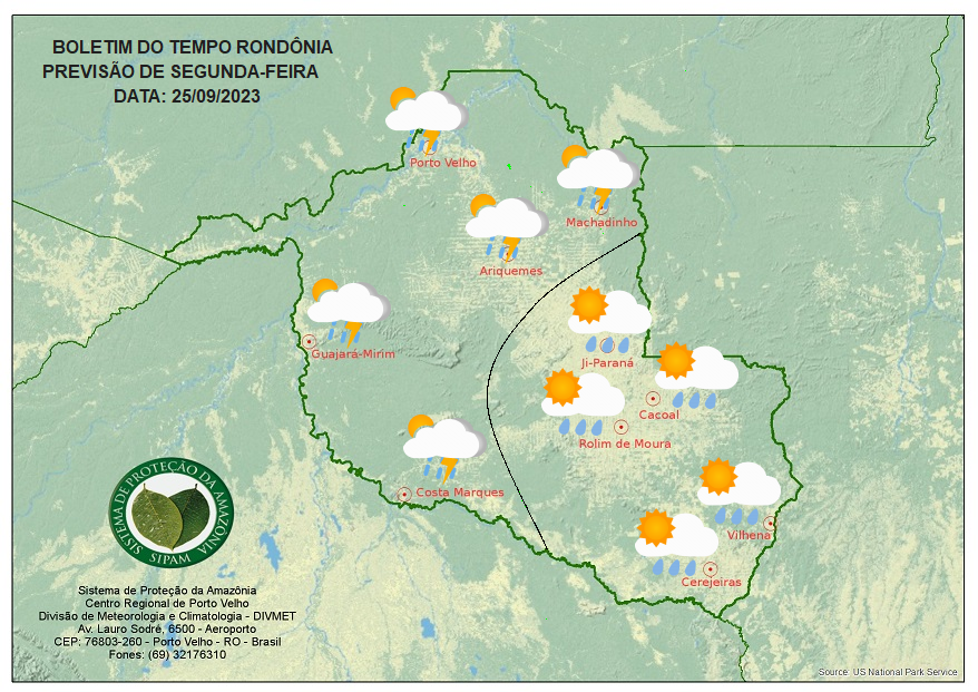 Para esta segunda-feira (25), a previsão é de sol e tempo abafado em todo o estado. O céu varia de parcialmente nublado a nublado com pancadas isoladas de chuva e trovoadas entre a tarde e a noite na capital, nos Vales do Guaporé, Mamoré e Jamari, na Ponta do Abunã, no Baixo Madeira e no Nordeste do estado.