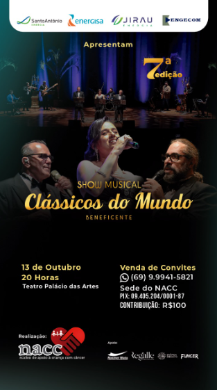 Anotem na agenda! O Núcleo de Apoio à Criança com Câncer estará promovendo no próximo dia 13 de outubro, às 20:00, no Teatro Palácio das Artes, na capital, o show musical beneficente ‘Clássicos do Mundo’. Essa é sétima edição e todo a renda é revertida para as obras do NACC, que desenvolve um lindo trabalho de acolhimento a crianças que lutam contra a doença, não só vindas de Rondônia, mas também de outros estados e países. Para adquirir os ingressos, basta entrar em contato pelo telefone 69 9 9941 5821. Imperdível e faz um bem enorme para o corpo, mente e alma!