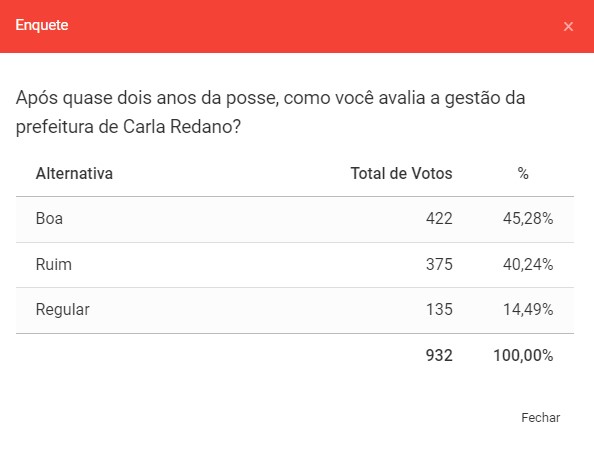 Dentre as alternativas estavam “boa”, “ruim” e “regular”. Redano teve boa aceitação entre os participantes da enquete. A maioria dos votantes acreditam que a Prefeita está fazendo uma boa gestão na cidade de Ariquemes.