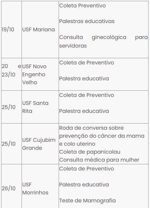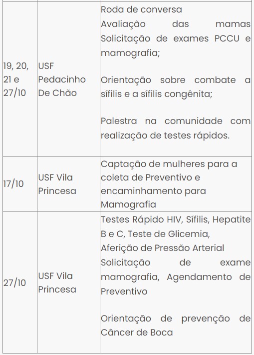 Desde o início do mês, mais de 20 atividades alusivas ao Outubro Rosa já foram realizadas pela Semusa, através das unidades de saúde e dos Núcleos de Educação Permanente. Até o final do mês, outros eventos serão realizados durante o horário de atendimento normal das unidades, conforme programação abaixo: