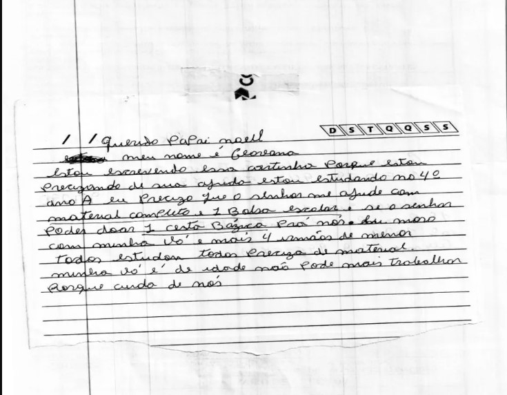 Um dos apelos comoventes é o de Geovana, estudante do 4º ano do ensino fundamental, que, além de pedir material escolar, solicita uma bolsa para ir à escola e a doação de uma cesta básica.