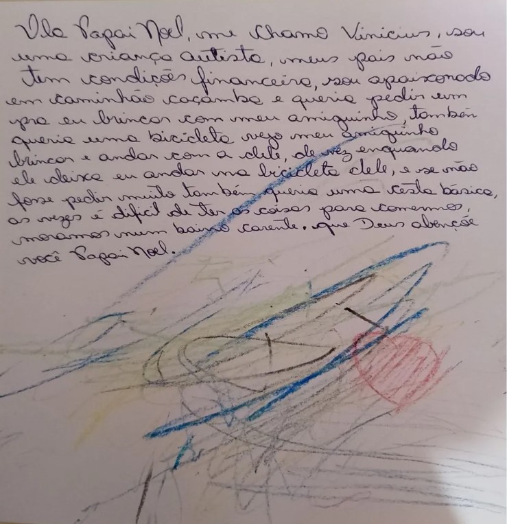 Outro pedido especial vem de Vinicius, uma criança autista de Ariquemes, que expressa o desejo por um caminhão de brinquedo e uma bicicleta. Em um tocante gesto de humildade, ele também pede uma cesta básica, explicando as dificuldades alimentares que enfrentam em seu bairro carente.