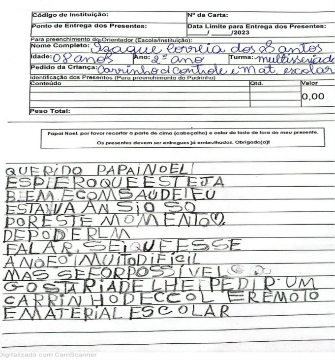 O pequeno Izaque, com apenas 8 anos, mostra compreensão ao reconhecer as dificuldades do ano e pede um carrinho de controle remoto e material escolar, expressando sua ansiedade pelo Natal.