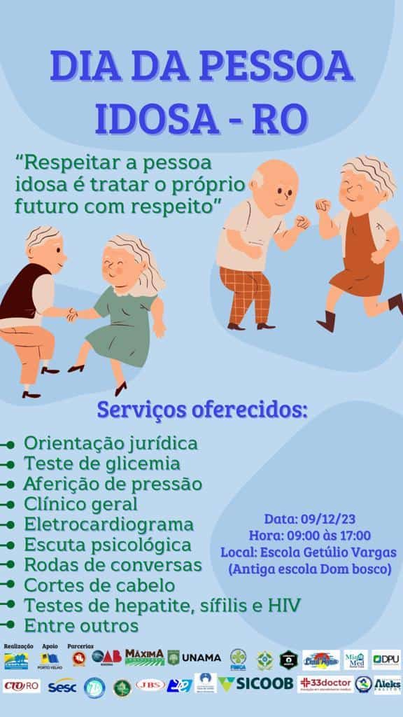 O Conselho Estadual dos Direitos da Pessoa Idosa-CEDPI em parceria com entidades públicas e da iniciativa privada,, irá realizar neste sábado (9), o Dia da Pessoa Idosa de Rondônia, com várias atrações culturais e ações sociais voltadas para a pessoa idosa. O evento será na Escola Estadual Getulio Vargas ( antigo colégio D. Bosco) das 09 às 17hs.
