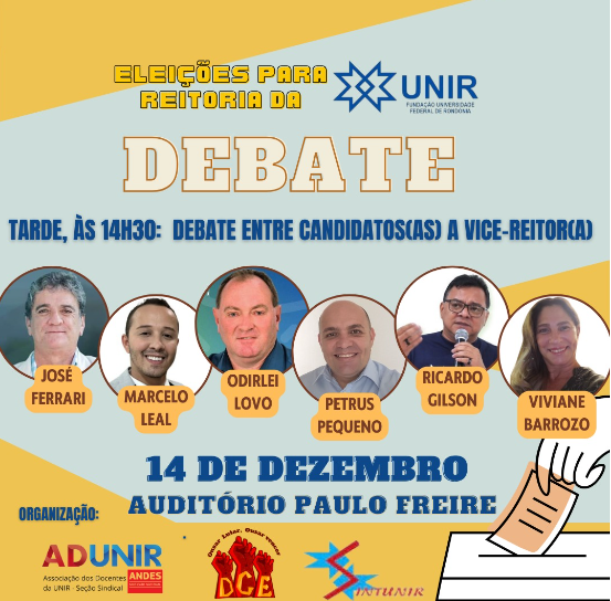 A Universidade Federal de Rondônia está em ritmo de eleição. Com a renúncia de Marcele Pereira, que foi a última eleita para ocupar o cargo, os grupos que dominam a cena na única universidade federal de Rondônia estão na disputa. Nomes é o que não falta. Inclusive no próximo dia 14, às 09h, haverá o debate entre os candidatos e candidatas ao posto máximo da instituição. Já à tarde, às 14h, ocorrerá o embate entre os candidatos(as) a vice-reitor.