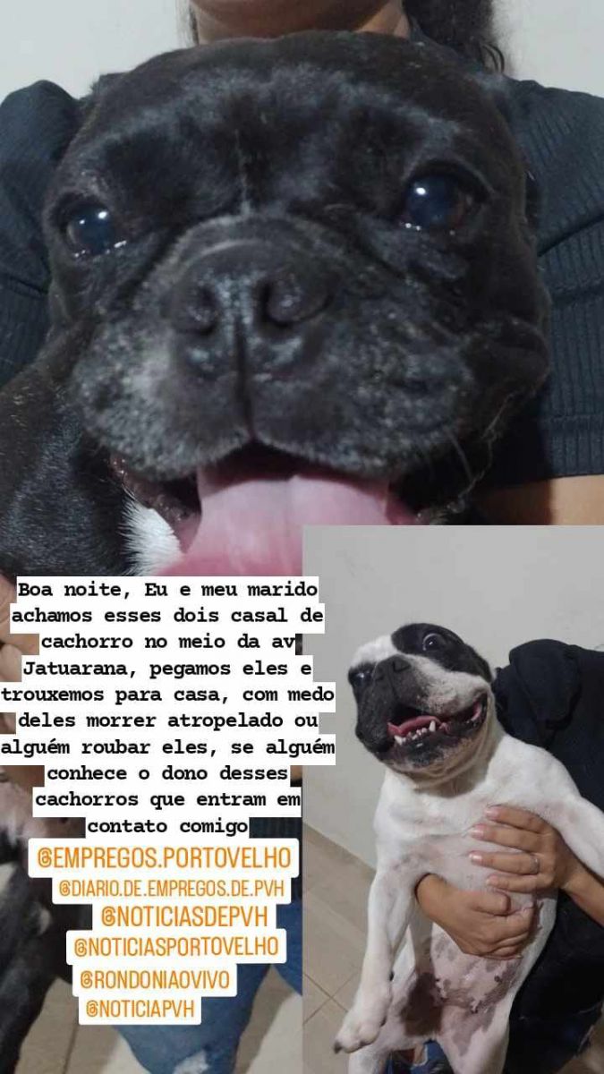 Rosaline Aquino entrou em contato com o Rondoniaovivo nesta quinta-feira (04) para anunciar que encontrou, junto com o marido, dois cachorros de graça durante a madrugada.