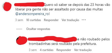 “Quero só saber se depois das 23 horas vão liberar pra gente não ser assaltado por causa das multas @andersonpereira_ro!”, escreveu um internauta.
