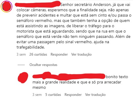 Um outro cidadão ainda sugeriu: “Senhor secretário Anderson, já que vai colocar câmeras, esperamos que a finalidade seja, não apenas de prevenir acidentes e multar que está sem cinto e/ou passa o semáforo vermelho, mas que também tenha a opção de quem está assistindo as imagens, de liberar o tráfego para o motorista que está aguardando, sendo que na rua em que o semáforo que está verde não tem ninguém passando. Além de evitar uma passagem pelo sinal vermelho, ajuda na trafegabilidade”.