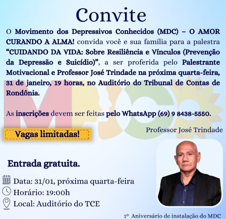 O Movimento dos Depressivos Conhecidos (MDC), com o lema “O amor curando a alma”, realiza a palestra “Cuidando da Vida: Sobre resiliência e vínculos (prevenção da depressão e suicídio)”, com o professor José Trindade, nesta quarta-feira (31), a partir das 19 horas, no auditório do Tribunal de Contas do Estado (TCE), em Porto Velho.