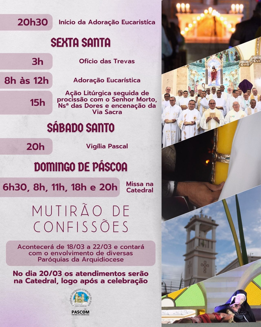 A programação da Semana Santa na Catedral começou ainda na última segunda-feira (25), e vai se estender até o Domingo de Páscoa (01), se encerrando durante um conjunto de missas tradicionais que acontecerão às 6h30, 8h, 11h, 18h e 20h.