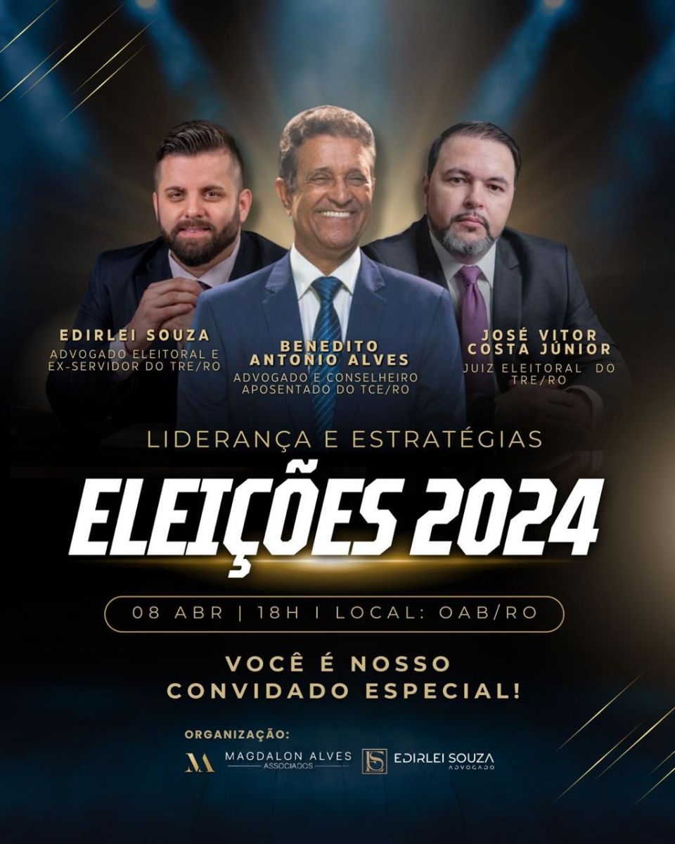 Um evento estará acontecendo, na noite da próxima segunda-feira(8), na sede da OAB-RO. Trata-se da palestra ‘Lideranças e Estratégicas - Eleições 2024”. Os palestrantes são o advogado Benedito Alves, ex-conselheiro do TCE-RO; José Vitor Júnior, juiz do TRE; e Edirlei Silva, advogado eleitoralista. Vale à pena se informar sobre o processo eleitoral que se aproxima. Informação sempre é importante!