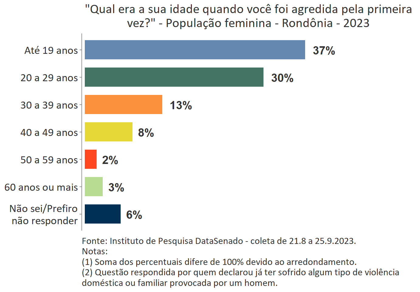 A pesquisa revelou também que as mulheres rondonienses têm a primeira experiência de violência aos 19 anos. 37% declararam que foi nessa idade que começaram as agressões. 30% relataram que começou entre os 20 e 29 anos; e 13% entre os 30 e 39 anos. Uma boa parte desses resultados mostra o que muitos já sabiam: é necessário investir em políticas públicas de proteção às mulheres em Rondônia. Do contrário, estaremos fadados a liderar as estatísticas de violência contra o sexo feminino. Muito triste!