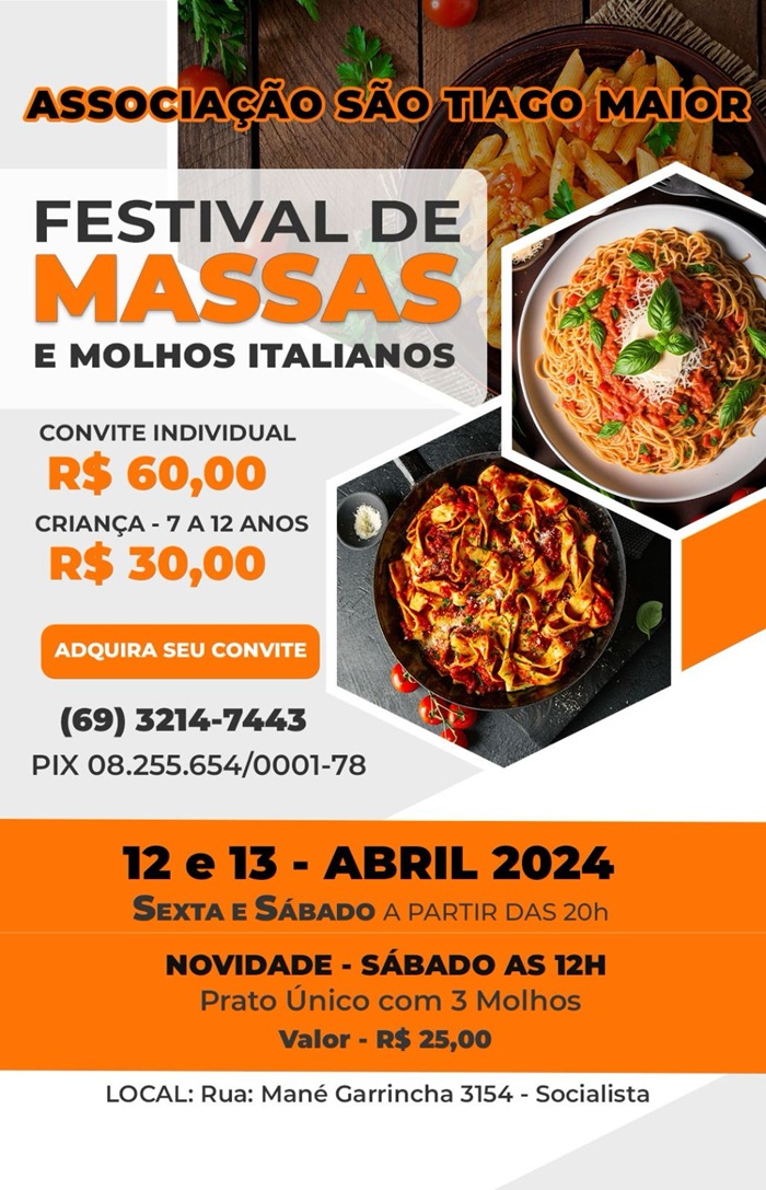 Um programa excelente para a família neste final de semana, trata-se do festival de molhos e massas da Associação São Thiago Maior. O evento já tradicional na paróquia do mesmo nome e acontece desde a sexta-feira(12) e termina neste sábado(13). Ela fica localizada na rua Mane Garrincha, 3154, bairro Socialista. Mais informações podem ser obtidas pelo telefone 69 3214 7443.