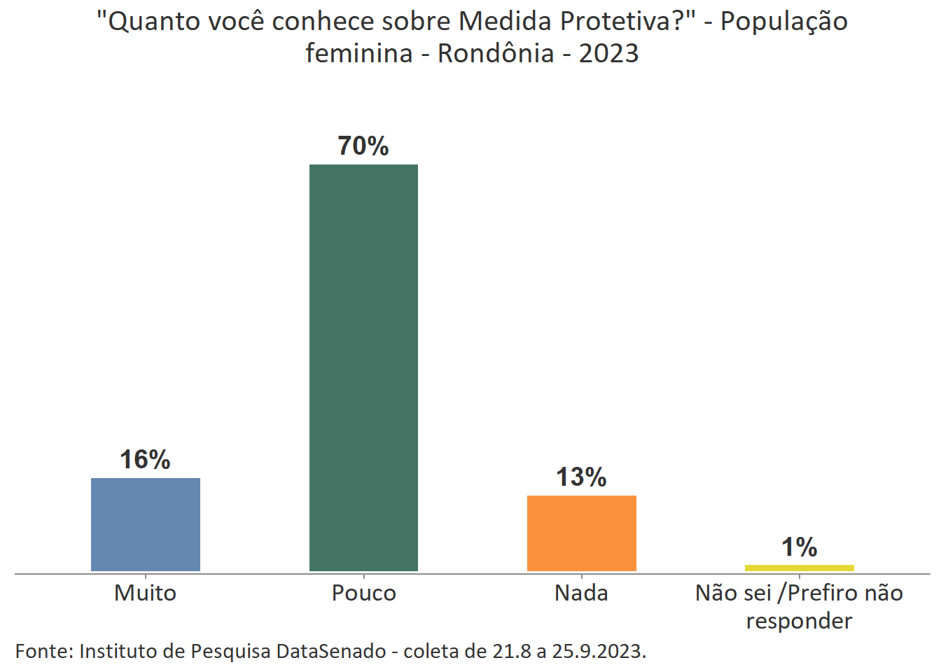 Outro dado interessante da pesquisa feita entre as mulheres de Rondônia, é o de que 70% diz saber pouco sobre medidas protetivas, 13% diz saber nada e apenas 16% afirma saber muito.