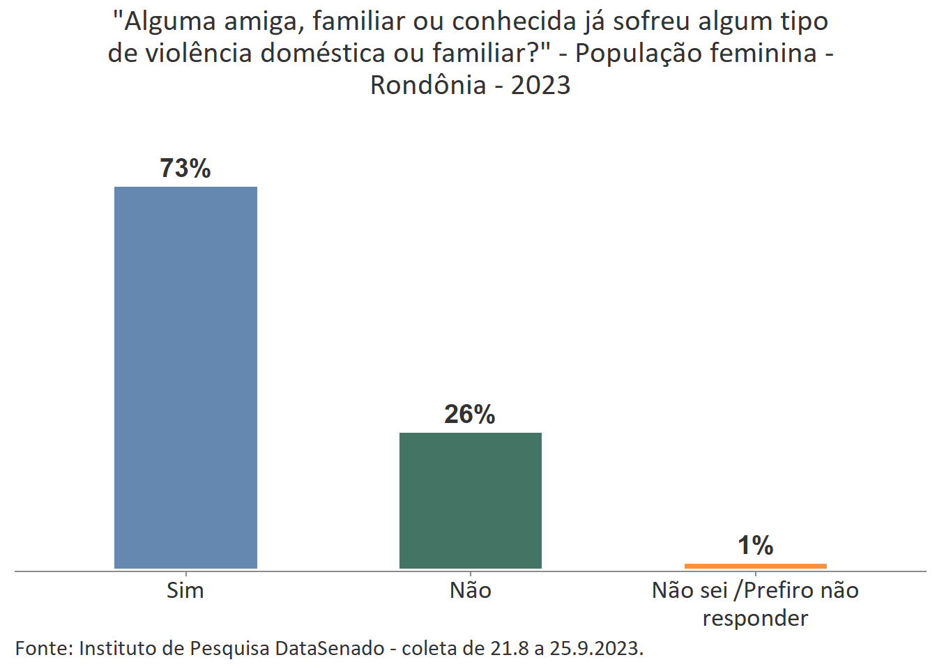 Perguntadas se alguma amiga, familiar ou conhecida já sofreu violência doméstica ou familiar, 73 % das entrevistadas disseram que sim; e 26 % não conheciam as vítimas. Nesse quesito, relataram que as formas mais comuns de violência eram a física(89%); psicológica(85%); moral(79%); patrimonial(46%); e sexual(31%).