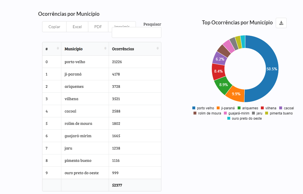 O levantamento mostra também que Porto Velho, como era de se esperar pela população maior, lidera o ranking, com o registro de 21.226 ocorrências. A capital é seguida por Ji-Paraná com 4.178 ocorrências e Ariquemes onde foram registradas 3728 ocorrências. Já a cidade com menos registros de ocorrências policiais em Rondônia, é Primavera de Rondônia, com apenas 27, em três meses.