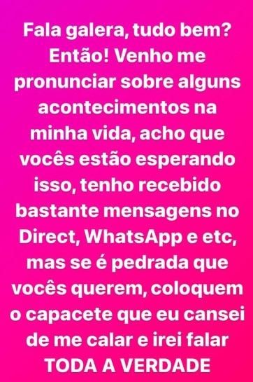 Nos stories, Gilson postou a seguinte mensagem: “Fala galera, tudo bem? Então! Venho me pronunciar sobre alguns acontecimentos na minha vida, acho que vocês estão esperando isso, tenho recebido bastante mensagens no Direct, WhatsApp e etc, mas se é pedrada que vocês querem, coloquem o capacete que eu cansei de me calar e irei falar. Toda a verdade”.