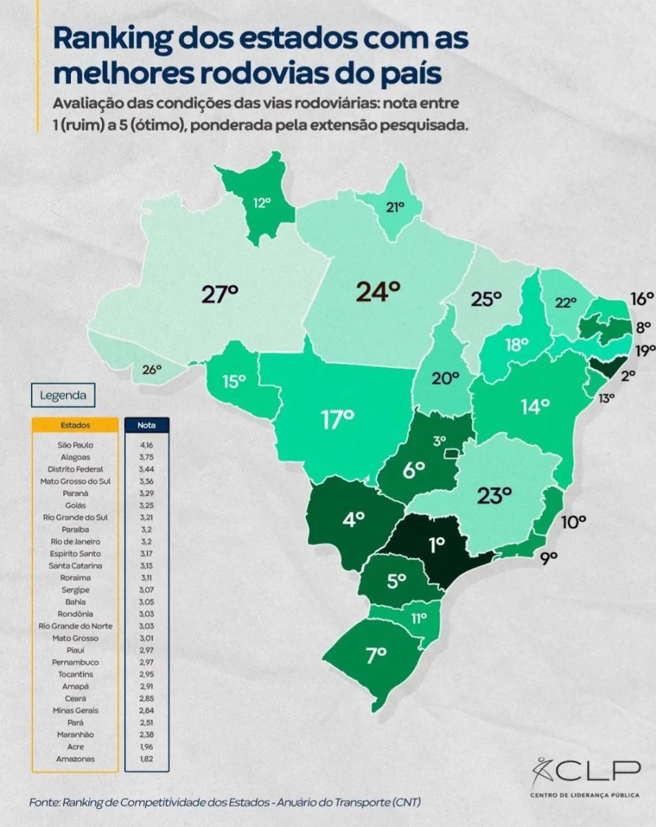 O ranking é liderado pelo estado de São Paulo com nota 4,16, seguido por Alagoas e o Distrito Federal. Na Região Norte, o estado melhor colocado é Roraima, na 12ª posição.