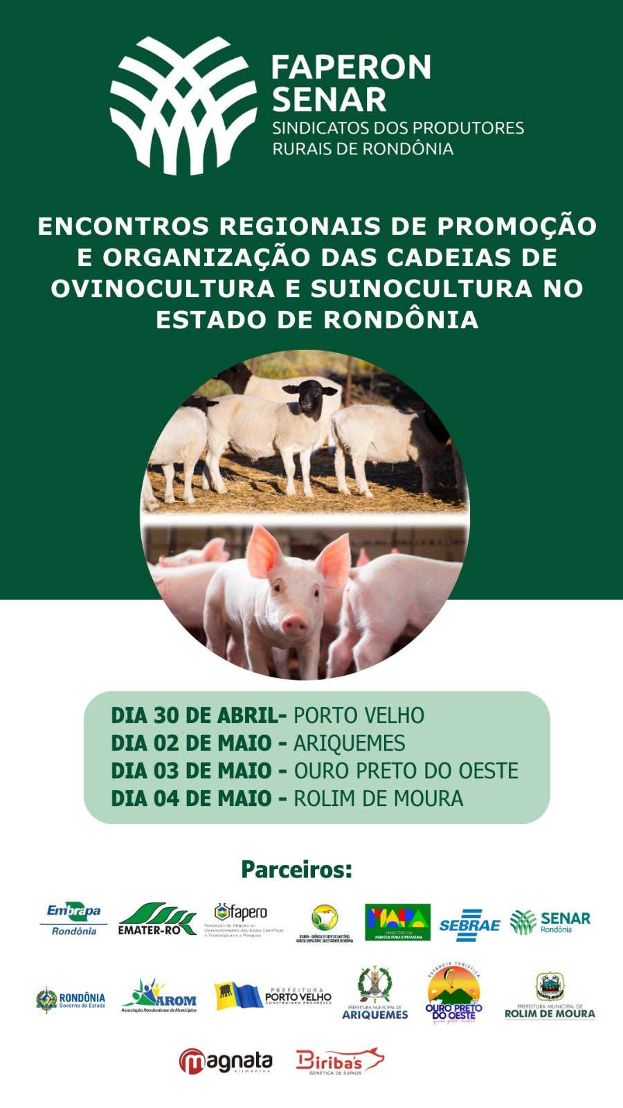 A Federação da Agricultura e Pecuária de Rondônia (Faperon) promove nas próximas semanas uma série de encontros regionais voltados à promoção e organização da Ovinocultura e da Suinocultura em Rondônia. Mais uma vez, o Sebrae RO se coloca como parceiro de iniciativas que buscam promover as mais diversas cadeias produtivas.