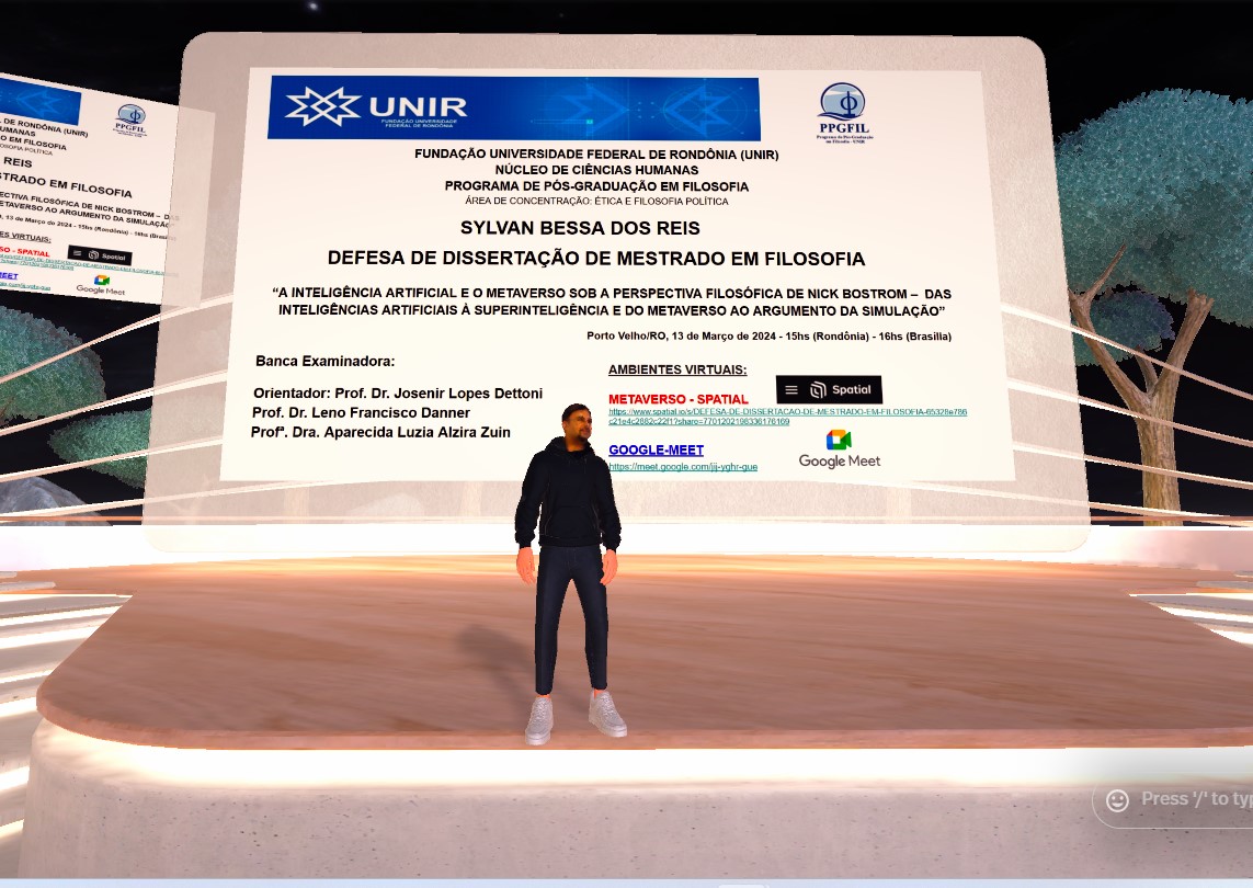 A ‘Inteligência Artificial e o Metaverso sob a Perspectiva Filosófica de Nick Bostrom – Das Inteligências Artificiais a Superinteligência e do Metaverso ao Argumento da Simulação’, é o título da dissertação de mestrado em Filosofia do professor da Faculdade Católica de Rondônia, Sylvan Bessa, no Programa de Pós-Graduação em Filosofia da Universidade Federal de Rondônia – UNIR. O estudo uniu o conhecimento milenar da filosofia com as novas tecnologias para demonstrar que é possível incorporar todos esses elementos no processo de aprendizado acadêmico. Tanto que para isso, durante a apresentação da tese, foram utilizados o metaverso, o tradicional espaço virtual do Google Meet e a videoconferência do WhatsApp. Sylvan Bessa que também é advogado provou que o mundo das novas tecnologias veio para ficar e que só nos resta nos adaptarmos a ele e tirarmos o melhor do que nos é oferecido!