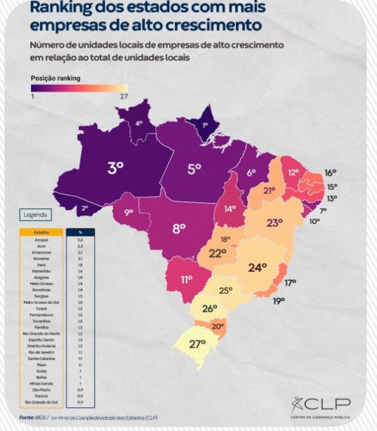 Informações fornecidas pelo Centro de Liderança Política (CLP), uma organização sem fins lucrativos com uma presença de 14 anos no Brasil, indicam que Rondônia se posicionou em 9º lugar no Ranking de Competitividade dos estados com maior número de empresas de alto crescimento, alcançando uma pontuação de 1,4.