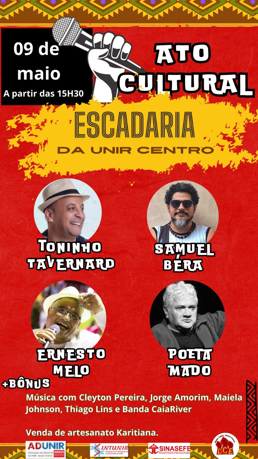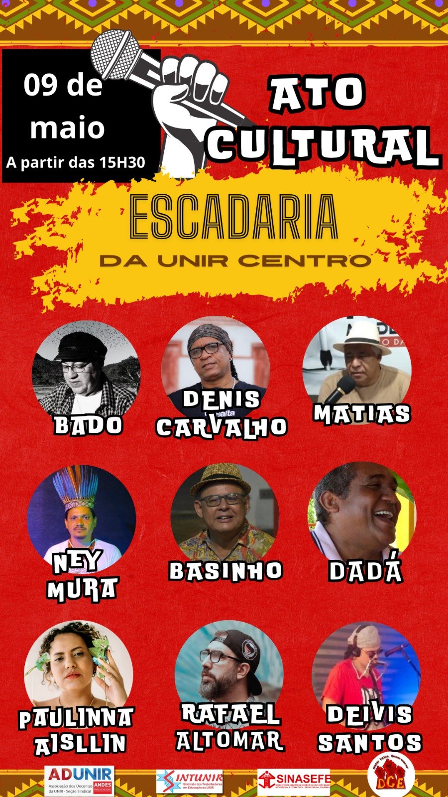 Além da participação de artistas do IFRO e da UNIR, a nata da cena cultural de Porto Velho se fará presente no ato: artistas renomados como Bado, Basinho, Denis Carvalho (Banda Nitro), Rafael Altomar (Beradelia), Samuel Béra, Ernesto Melo, Dadá, poeta Mado e outras atrações estão confirmadas para o ato que inicia às 15:30 e se estenderá até à noite. “As intervenções artísticas também fazem parte do protesto popular, por isso, convidamos a todos e todas a participar do nosso ato político e cultural”, destaca o prof. Valdir Aparecido, diretor da ADUNIR.
