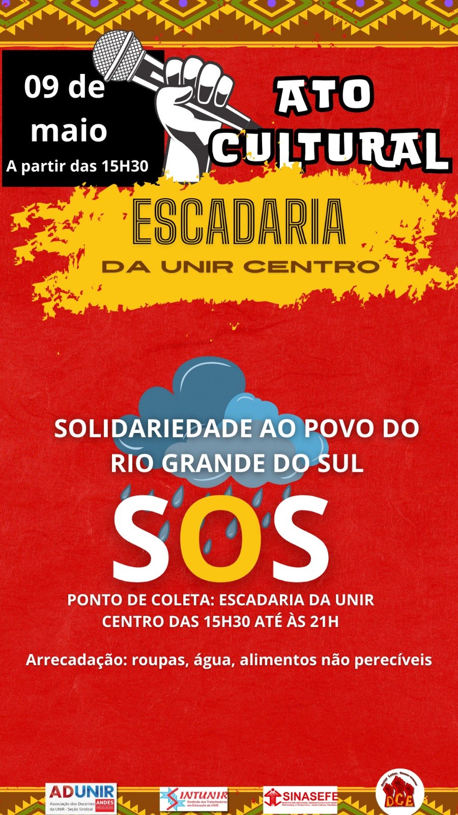 O evento também é ponto de arrecadação para as vítimas da tragédia dos últimos dias que abalou o estado do Rio Grande Sul. A ADUNIR, SINTUNIR e SINASEFE organizam a campanha para enviar ajuda à população atingida pelas enchentes naquele estado.