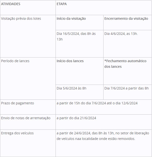O leilão será realizado nos dias e horários, conforme cronograma abaixo: