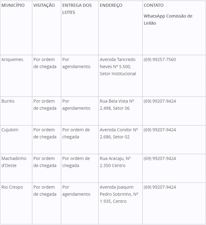 Os veículos que serão leiloados encontram-se removidos nos pátios das Ciretrans e/ou Postos Avançados, nos endereços abaixo especificados, devendo ser verificadas previamente pelos arrematantes as regras de cada Ciretran/Posto Avançado quanto à entrega dos lotes.