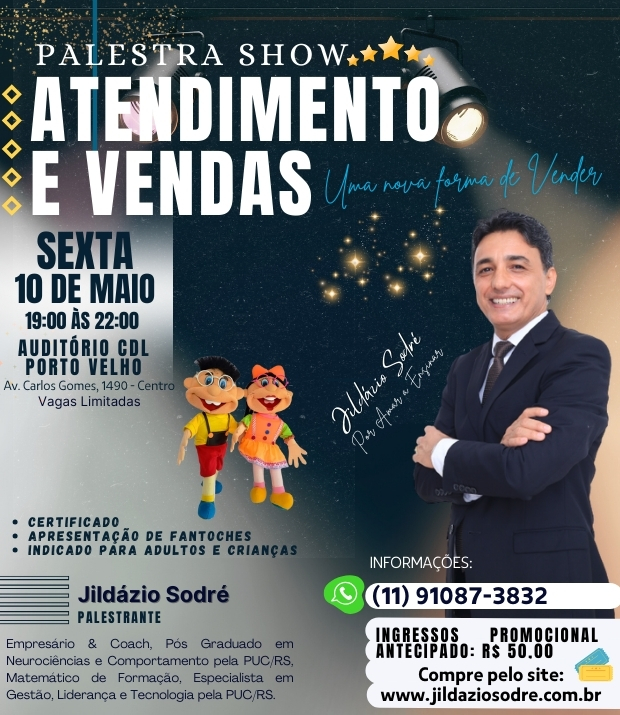 Palestra Show de Atendimento e Vendas: Descubra uma nova abordagem para vender e atender seus clientes, ministrada pelo renomado palestrante empresário e coach Jildázio Sodré.