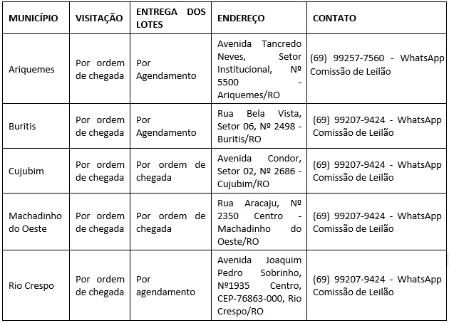 O diretor Técnico de Veículos, Tiago Costa, explica que serão leiloados 693 veículos, entre motos, motonetas, automóveis e camionetas, sendo 194 em Ariquemes, 174 em Buritis, 147 em Cujubim, 166 em Machadinho e 12 em Rio Crespo. “Os procedimentos serão online, através da Internet, na qual os lances serão realizados por meio de acesso identificado no site oficial do Detran”.