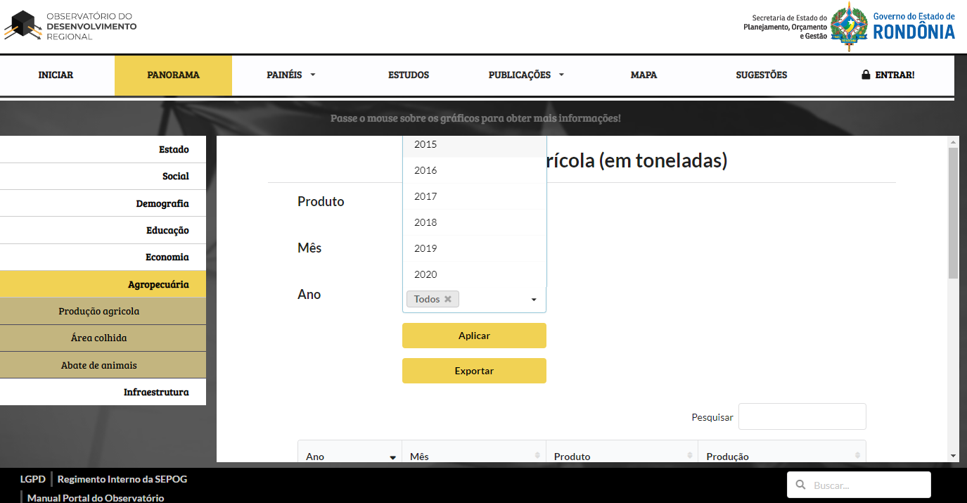 O Governo de Rondônia possui o site Observatório do Desenvolvimento Regional. A ideia é muito interessante. Lá, é possível encontrar dados de Rondônia sobre vários assuntos, desde de segurança pública, educação entre outros. No entanto, falta atualização. Só para se ter uma ideia, já que está acontecendo a RO Rural Show, os dados sobre a agropecuária rondoniense só constam até 2020. Então, se um empresário, pesquisador ou quem tiver interesse no tema quiser ver números atualizados vai se decepcionar, pois, as informações mais recentes são de quatro anos atrás. Pessoal da Secretaria de Planejamento, |Orçamento e Gestão, responsável pelo portal, vamos atualizar essas informações! Rondônia agradece!