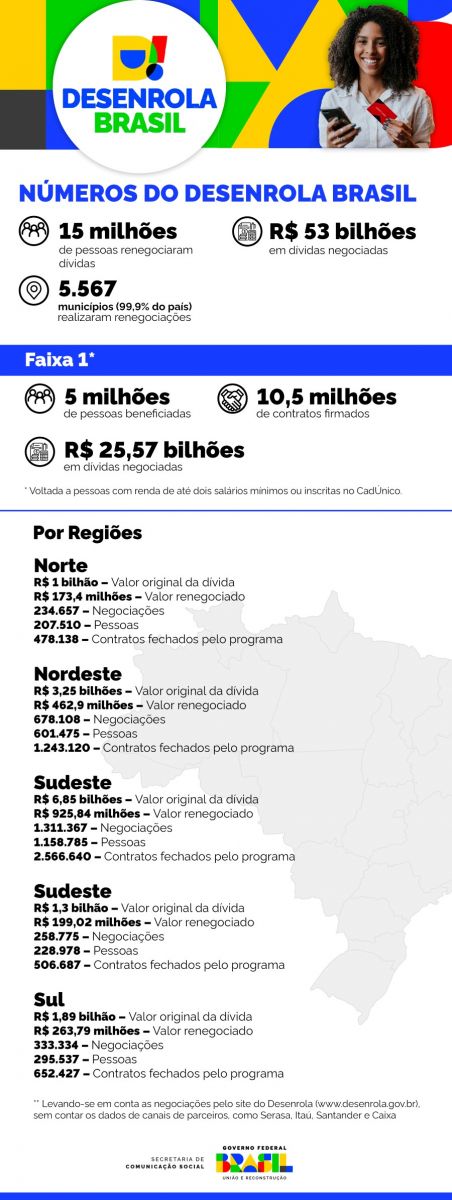 O Desenrola beneficiou 15 milhões de pessoas com a negociação de R$ 53 bilhões em dívidas e reduziu a inadimplência entre a população que mais precisa de apoio. A Faixa 1 teve adesão de cinco milhões de pessoas com a negociação de mais de R$ 25 bilhões em débitos. O programa foi encerrado em 20 de maio.