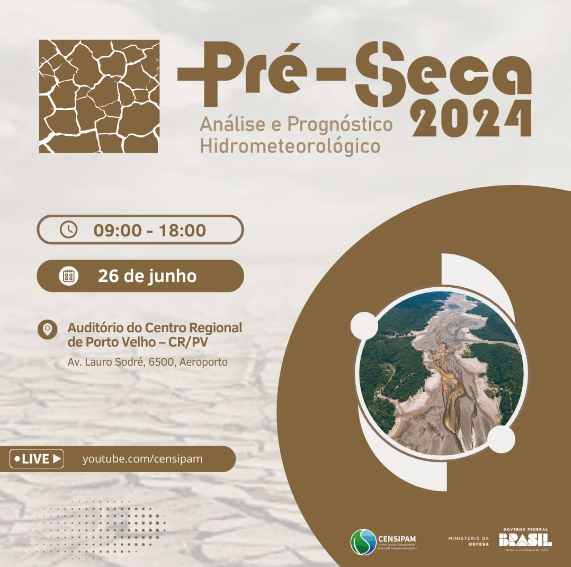 O Centro Gestor e Operacional do Sistema de Proteção da Amazônia (Censipam) realizará a edição de 2024 do evento "Pré-Seca" em Porto Velho-RO, dia 26 de junho. O evento reunirá profissionais de diversas instituições governamentais e não governamentais do Brasil para discutir as condições climáticas e hidrológicas atuais das principais bacias hidrográficas e traçar prognósticos para a seca de 2024. Serão 8 horas, com mesas redondas e palestras técnicas visando engajar a comunidade científica e órgãos parceiros. O público-alvo inclui a Defesa Civil, órgãos ligados à hidrologia e meteorologia, geração de energia, transporte fluvial e rodoviário, secretarias de meio ambiente estaduais e municipais, administração de portos e universidades. Mais informações no link .