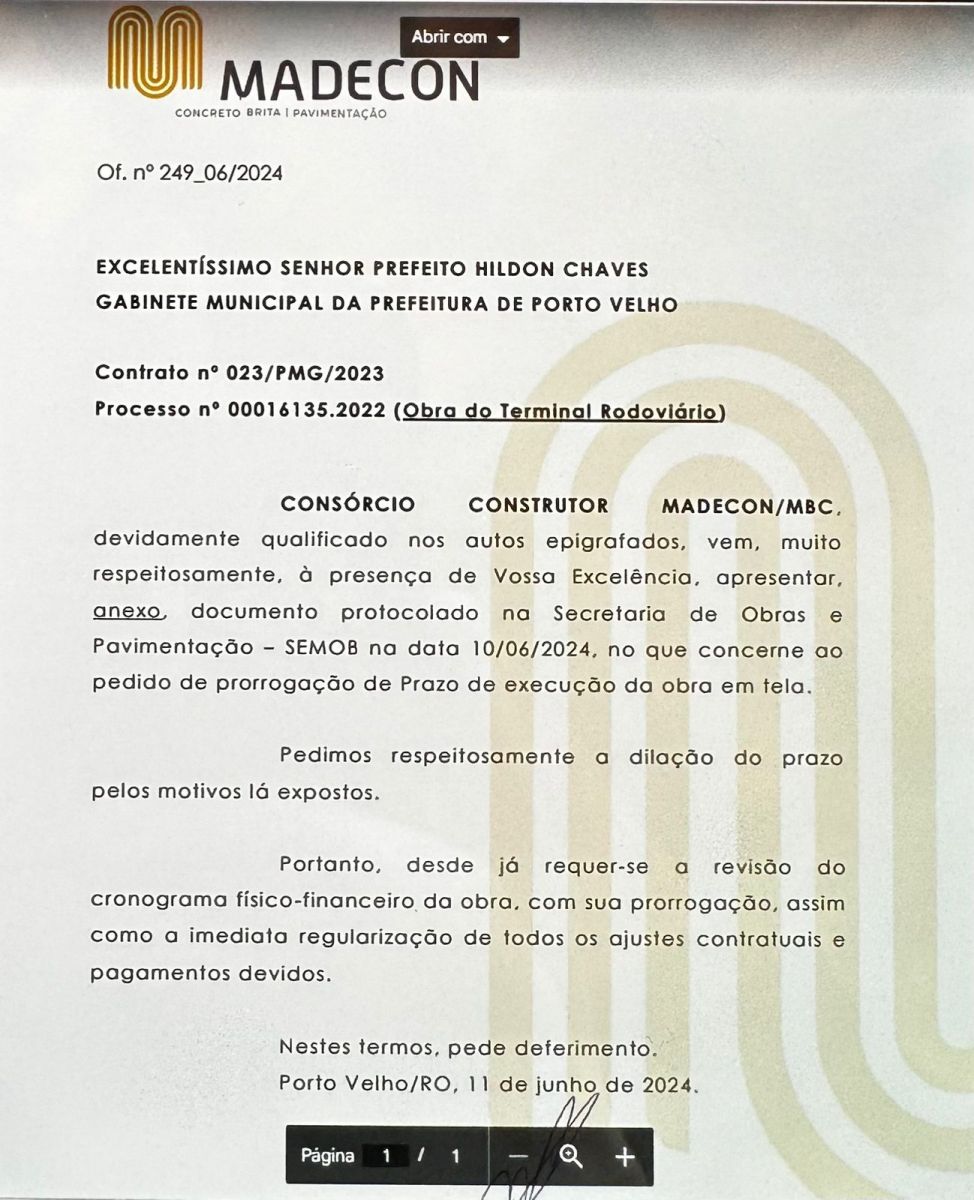 O Ofício nº 249_06/2024, datado do dia 11 de junho deste ano, informa que o Consórcio protocolou junto a Secretaria de Obras e Pavimentação (SEMOB) em 10/06/2024, o pedido de prorrogação do prazo de execução da obra. Não bastando o adiamento, o Consórcio solicita ainda, a revisão do cronograma físico-financeiro da obra e a imediata regularização de todos os ajustes contratuais e pagamentos devidos.
